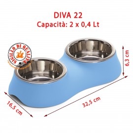 Diva la doppia ciotola per cani e gatti comoda e ideale per cibo secco o umido oppure acqua. Dalla base in plastica rigida si estrae la seconda ciotola in acciaio inox resistente e atossica. Facilmente lavabile per assicurare al vostro Pet la massima igiene. Il bordo rialzato della ciotola consente di contenere il cibo e l’acqua non disperdendoli all’esterno. Diva è una ciotola in acciaio con rivestimento esterno in plastica dai colori allegri. È dotata di piedini antiscivolo per offrire una grande stabilità durante l’utilizzo. Grazie alle comode impugnature laterali che permettono una presa sicura si può spostare facilmente. Scegliete la ciotola più adatta al vostro amico tra cinque diverse capacità: 0.4, 0.9, 1.9, 2.8 litri o doppia da 0,4+0,4 litri. Sicuramente per gatti e cani di piccola taglia sono adatte le ciotole Diva 2, Diva 4 e Diva 22 mentre per i cani di media e grande taglia le ciotole Diva 6 e Diva 8.