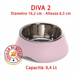 Diva la doppia ciotola per cani e gatti comoda e ideale per cibo secco o umido oppure acqua. Dalla base in plastica rigida si estrae la seconda ciotola in acciaio inox resistente e atossica. Facilmente lavabile per assicurare al vostro Pet la massima igiene. Il bordo rialzato della ciotola consente di contenere il cibo e l’acqua non disperdendoli all’esterno. Diva è una ciotola in acciaio con rivestimento esterno in plastica dai colori allegri. È dotata di piedini antiscivolo per offrire una grande stabilità durante l’utilizzo. Grazie alle comode impugnature laterali che permettono una presa sicura si può spostare facilmente. Scegliete la ciotola più adatta al vostro amico tra cinque diverse capacità: 0.4, 0.9, 1.9, 2.8 litri o doppia da 0,4+0,4 litri. Sicuramente per gatti e cani di piccola taglia sono adatte le ciotole Diva 2, Diva 4 e Diva 22 mentre per i cani di media e grande taglia le ciotole Diva 6 e Diva 8.